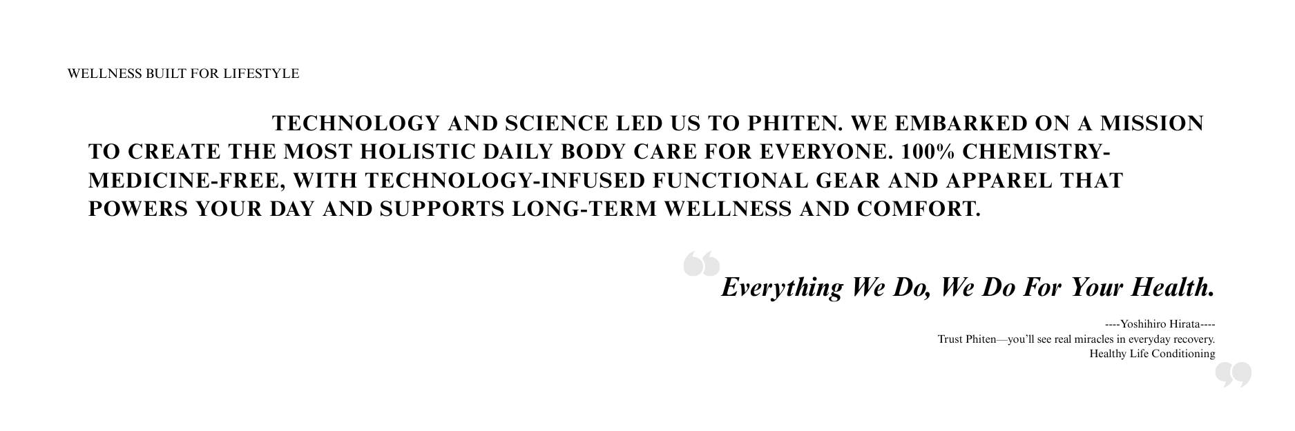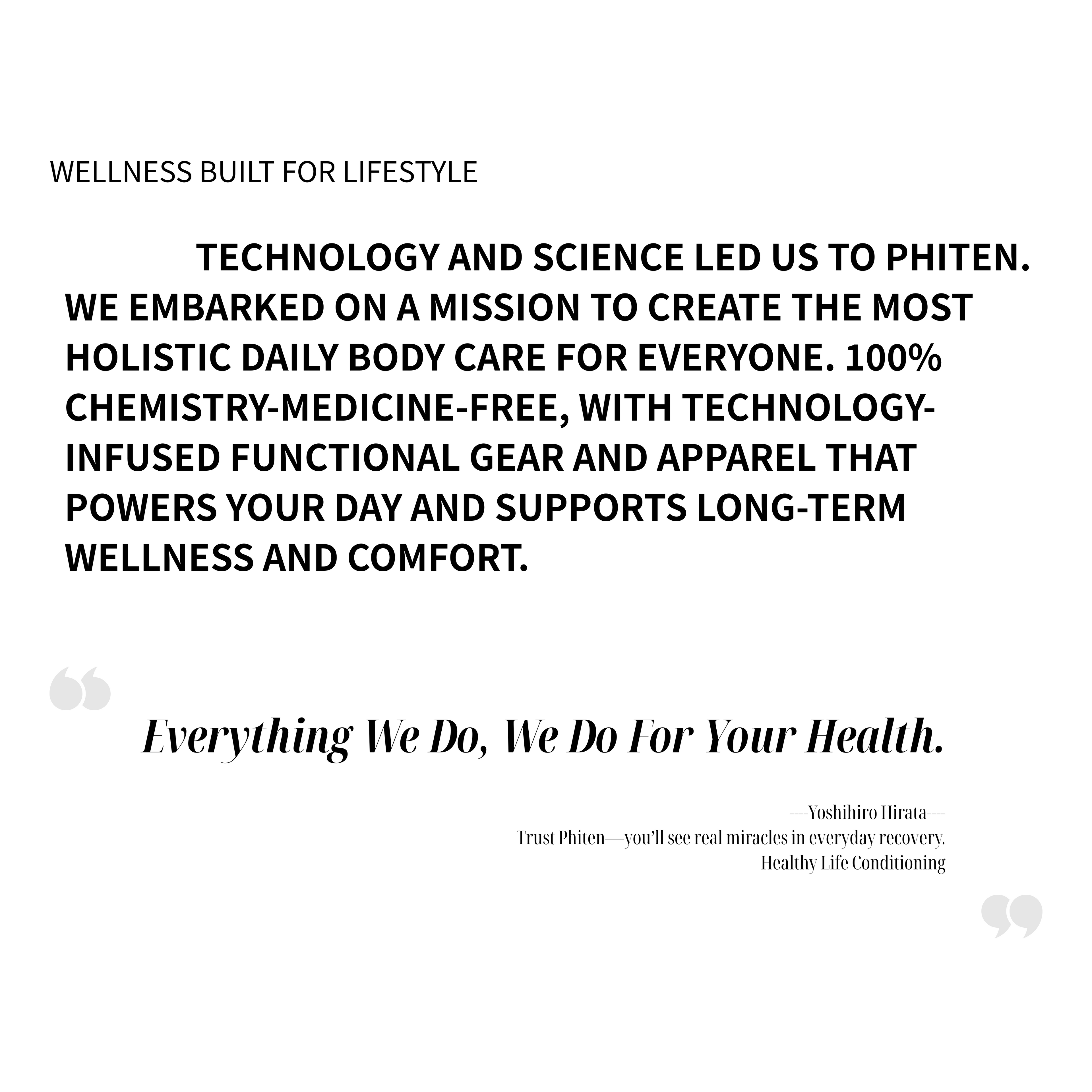 Phiten blends award-winning Japanese Health Technology with everyday essentials. Our patented technology helps promote fast recovery, care relaxation, and enhanced performance.
